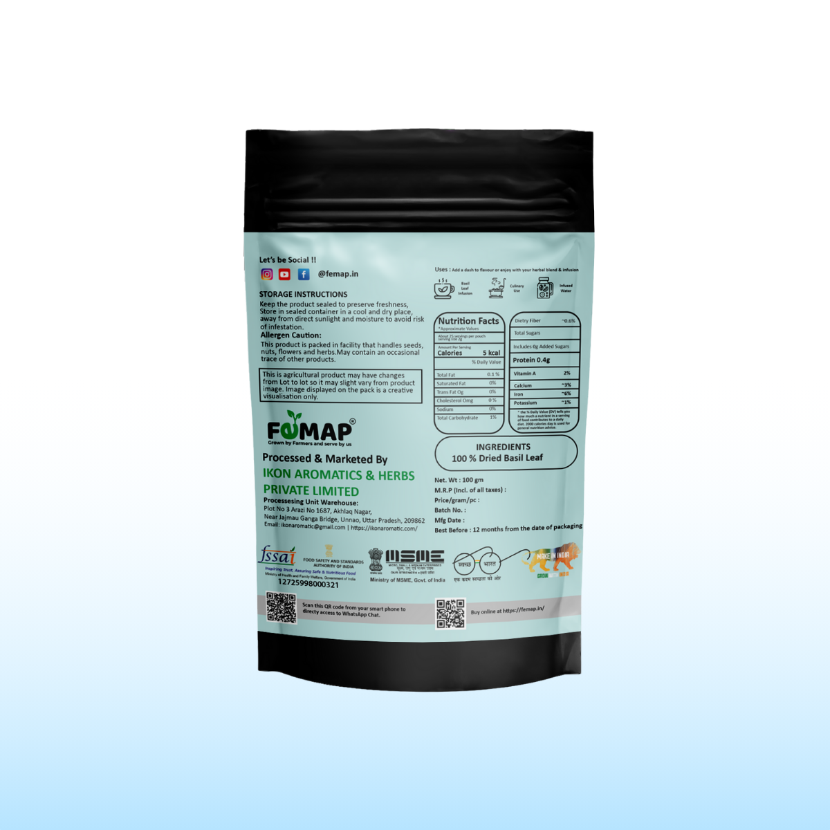 Dried Basil Tulsi Leaves (Ocimum basilicum) are carefully harvested, cleaned, and naturally dried to preserve their fresh aroma, colour, and leaf quality. This product contains only single-ingredient herbal leaves, with no added preservatives, artificial colours, or flavourings.